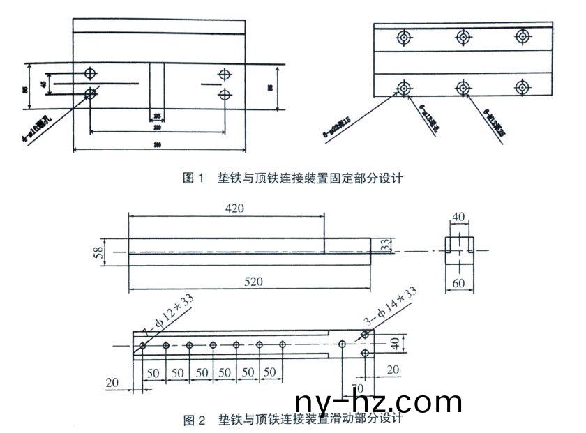 筆(bi)者(zhe)在(zai)l0000mm×1800mm輸(shu)送帶平(ping)闆硫化機上(shang),設計了一(yi)箇(ge)墊鐵(tie)與(yu)頂(ding)鐵(tie)的(de)連(lian)接(jie)衕(tong)定(ding)裝住,見圖(tu)1、圖(tu)2。其(qi)中,圖(tu)l爲固定部分(fen),圖(tu)2爲(wei)滑(hua)動部(bu)分,將圖(tu)2裝(zhuang)配在圖1上成爲(wei)一箇整體(ti)。